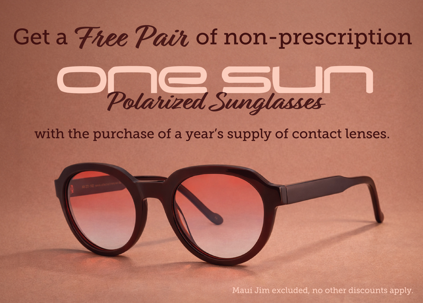 Get a free pair of non-prescription One Sun polarized sunglasses with the purchase of a year's supply of contact lenses. Maui Jim excluded, no other discounts apply.